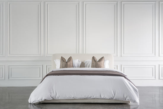 The Alora bed speaks in gentle curves and refined proportions. Its gracefully arched headboard creates a focal point that's both substantial and delicate, a balance difficult to achieve but beautiful to behold. Upholstered in soft linens or sumptuous velvets, the Alora brings romance without excess.